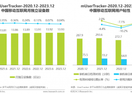 核心摘要: 网民变化 用户规模趋于饱和,增速放缓: 截至2023年12月,中国移动互联网月独立设备数达13.93亿台,与年中相比仅增长了微小的万分之四;网民人均单日使用时长为271.7分钟、人均单