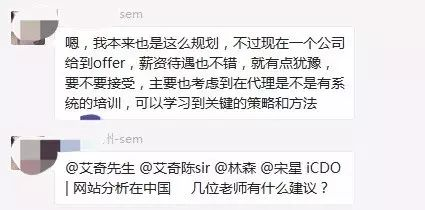 J的两个方向选择,还有很多的不确定,如「代理公司或成熟的公司,可能会有系统的培训」、「甲方公司,可能还是要自己一个人摸索,没有人指导」,正是因为这些「可能」性,导致了现在接到一个公司的offer,薪资待遇也不错,可是犹豫了要不要接受。犹豫的原因主要是「考虑代理公司是不是有系统的培训,可以学习到关键的策略和方法」?