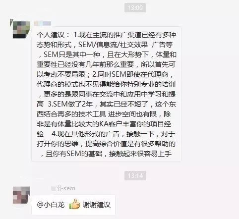 3.SEM做了2年,其实已经不短了,这个东西结合再多的技术工具 进步空间也有限,除非是有体量比较大的KA客户丰富你的项目经验;