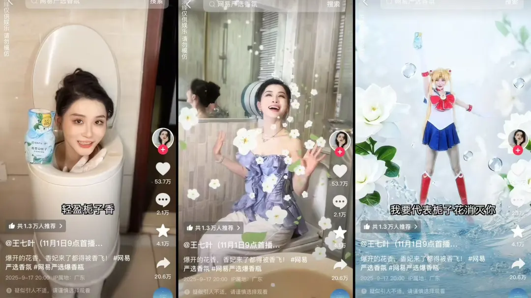 比如9月为网易严选爆香瓶所做的广告中,王七叶分别化身马桶、dj、天使,上演了三段匪夷所思的“除臭”故事,以一种离谱却又合理的方式将产品的特性展现出来,并收获了53.7万点赞。
