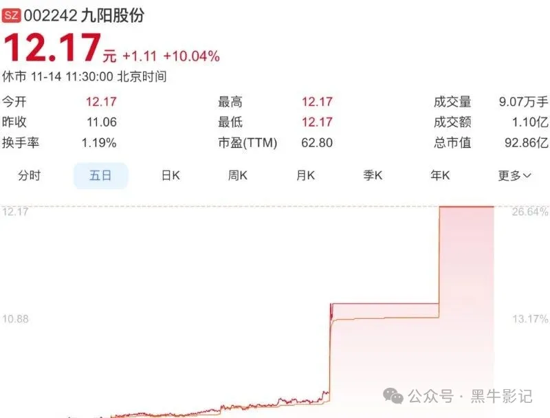 九阳豆浆近期上架「哈基米南北绿豆浆」,一上线就冲上热门,全平台预估销量过百万单,间接带动资本市场这边,九阳股份直接拉了两个涨停板。